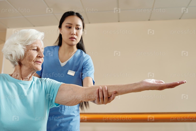 Женщина, выполняющая упражнения под контролем молодого физиотерапевта