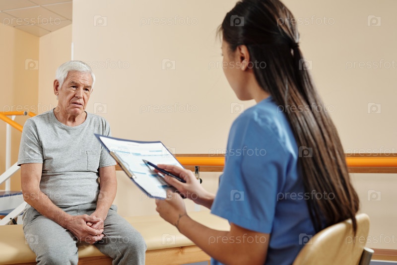 Пожилой мужчина слушает физиотерапевта в больнице