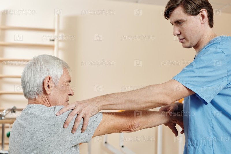 Помощник медсестры, упражняющий руку старшего мужчины Мужчина