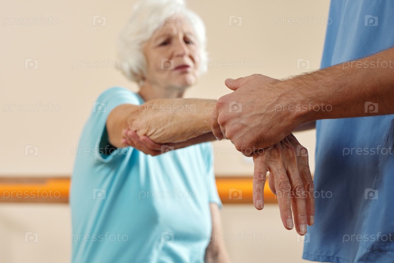 Врач упражняет руку дефокусированной пожилой женщины, сокрушающейся от боли