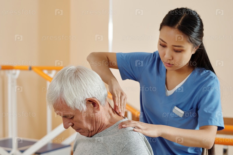 Молодая медсестра дает терапевтический массаж пожилому пациенту