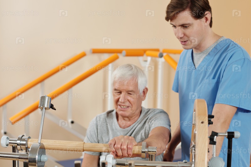 Помощник медсестры помогает пожилому мужчине делать физические упражнения в спортзале Мужчина