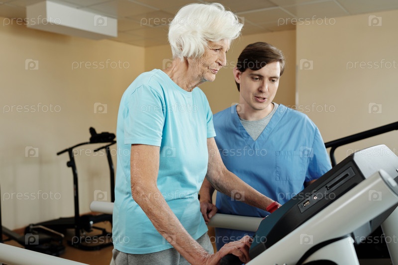 Женщина ходит на беговой дорожке под контролем мужского физиотерапевта в спортзале