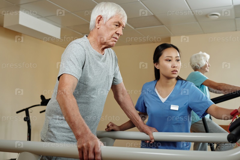 Пожилой мужчина ходит на беговой дорожке под контролем молодой медсестры