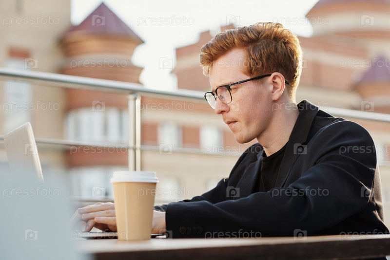 Молодой сконцентрированный мужчина работает на ноутбуке за столом в кафе