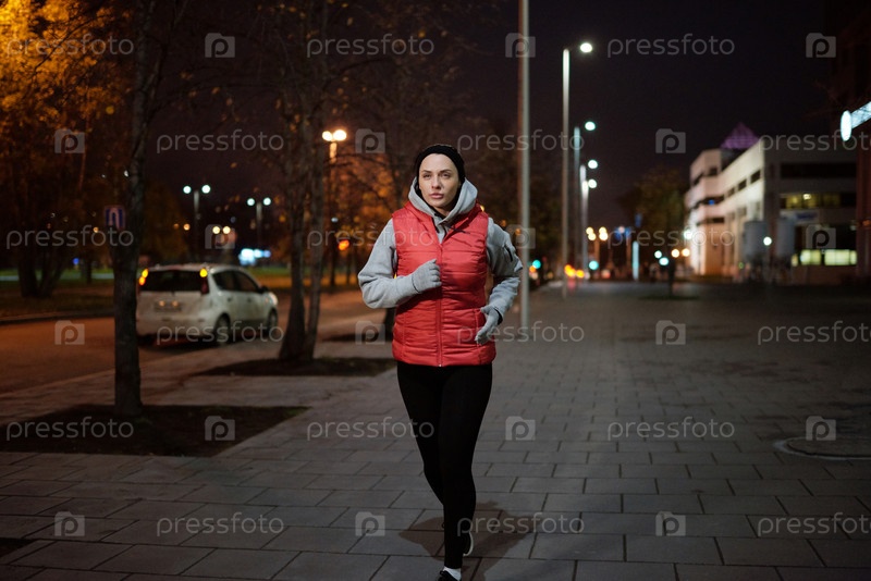 Молодая женщина в тёплой активной одежде бежит по тротуару
