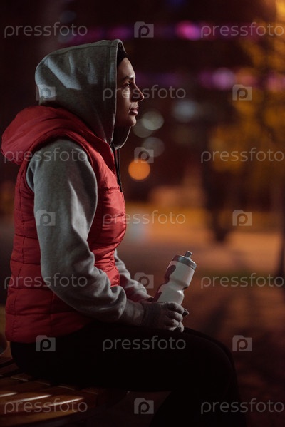 Женщина, отдыхающая после тренировки со спортивной бутылкой осенним вечером