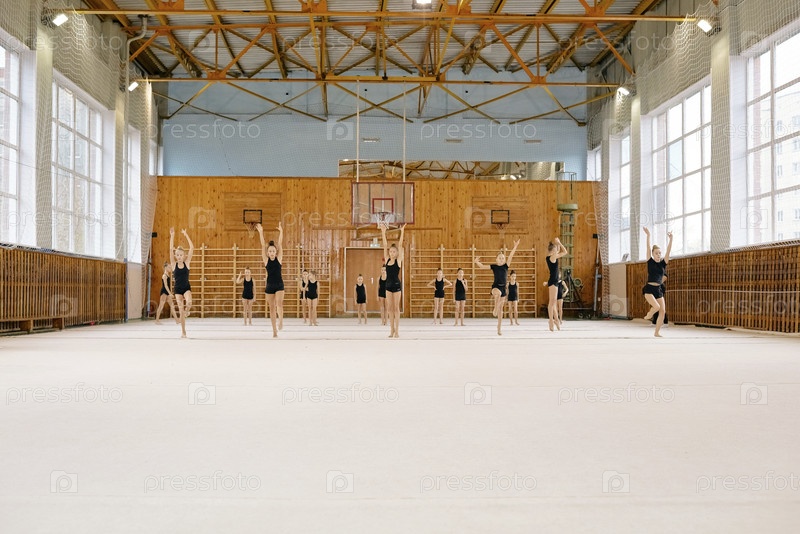 Группа девочек в возрасте до девятнадцати лет, практикующих гимнастическую рутину в спортзале