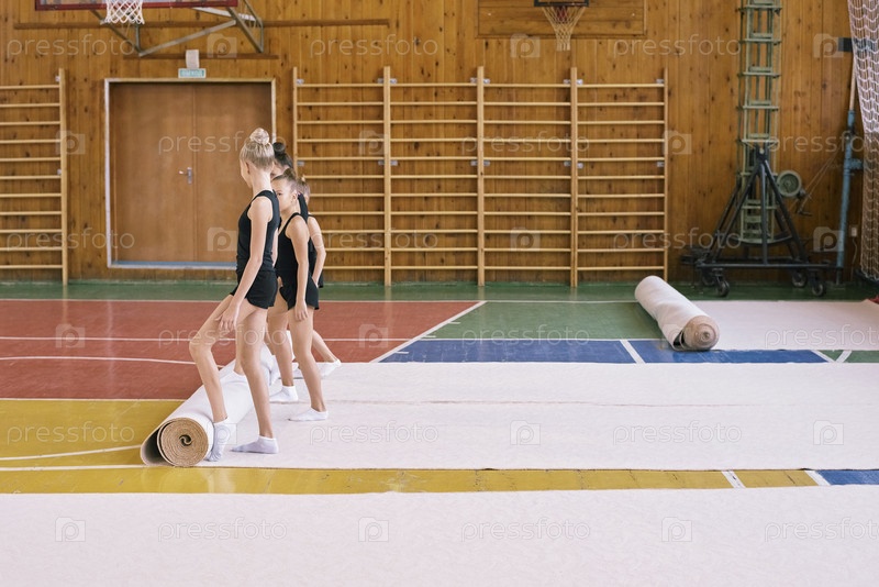 Группа девочек, готовящих гимнастический коврик в спортивном зале вместе