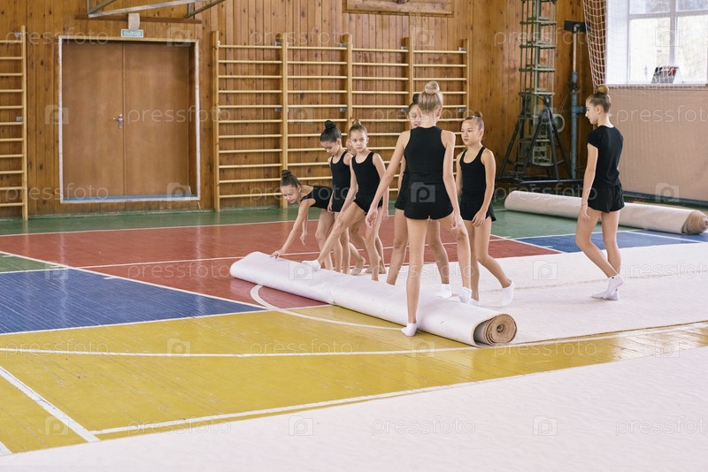 Группа девятнадцатилетних девочек, готовящих гимнастический коврик в спортивном зале
