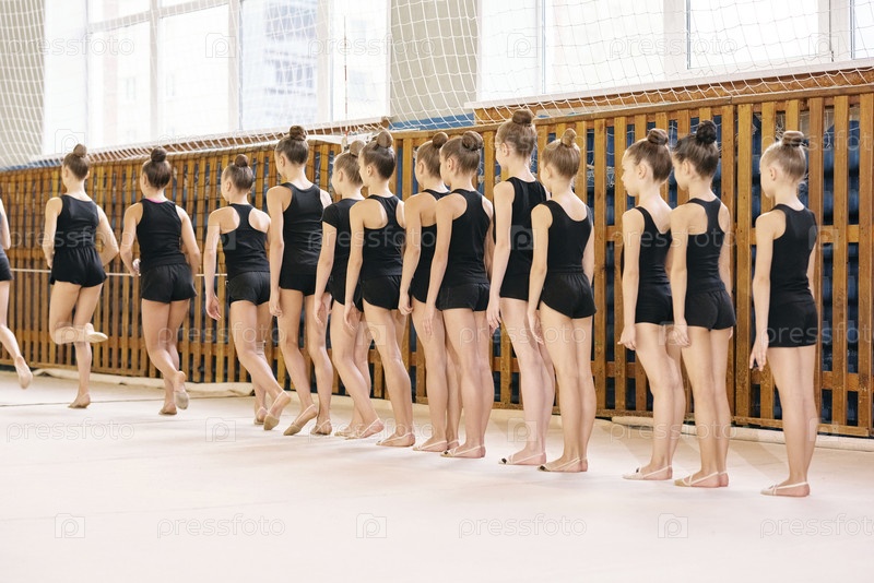 Группа девочек в возрасте до девятнадцати лет, занимающихся гимнастикой в тренировочном зале