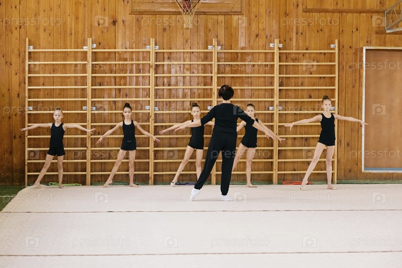 Группа девочек-подростков, занимающихся гимнастикой с женским тренером