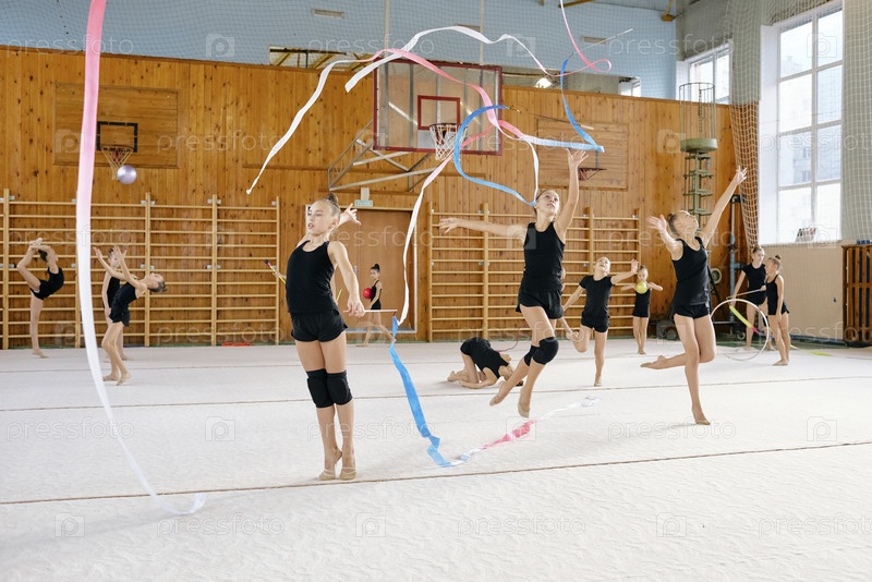 Группа девятнадцатилетних девочек, практикующих ритмическую гимнастику с лентами