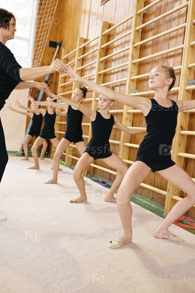 Группа девочек в возрасте до девятнадцати лет, практикующих балетные позы во время урока танцев