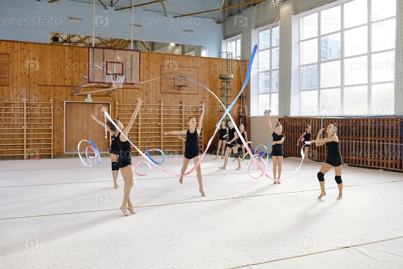 Группа девочек-подростков, выполняющих ритмическую гимнастику в помещении