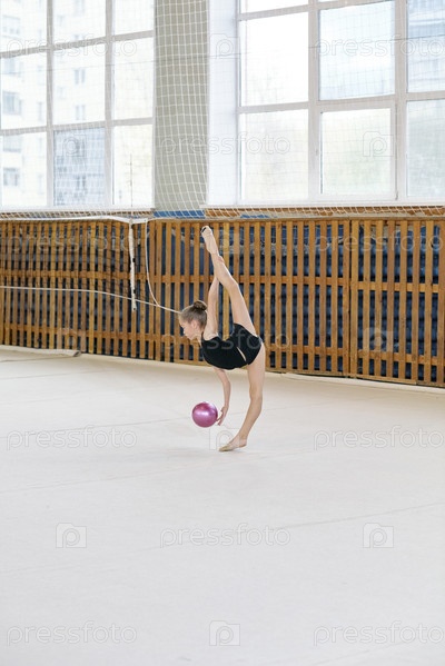 Девушка-подросток выполняет ритмическую гимнастику с мячом