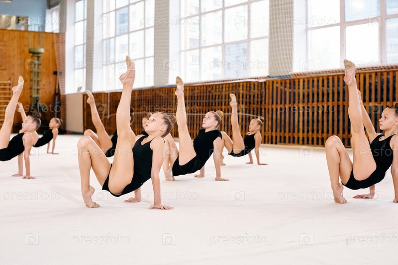 Группа девочек-подростков, практикующих синхронизированную гимнастическую рутину в помещении