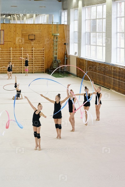 Группа девочек-подростков, выполняющих ритмическую гимнастику в помещении