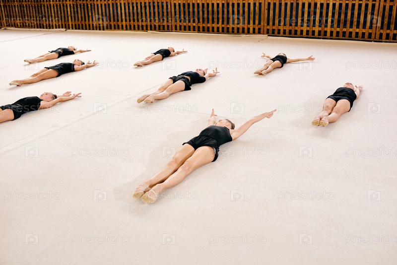Группа молодых девушек, выполняющих синхронизированную гимнастическую рутину