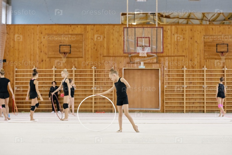Десятнадцатилетние девочки практикуют ритмическую гимнастику с крючками в помещении