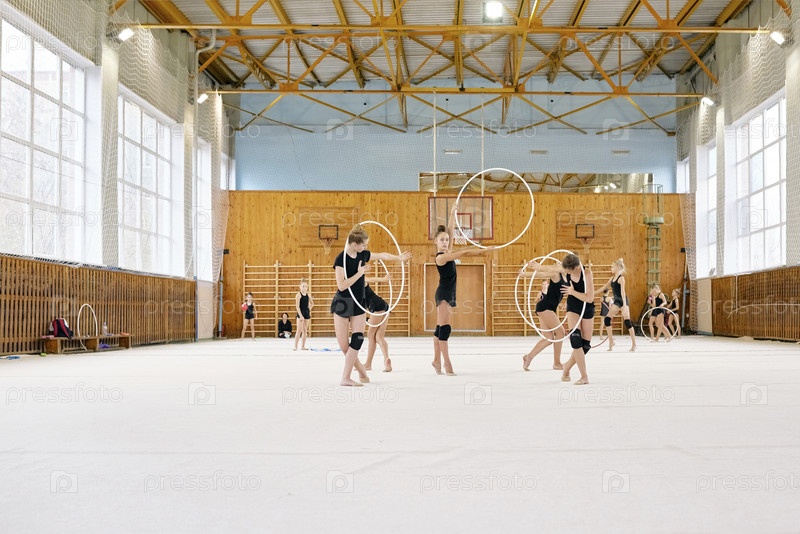 Группа девочек в возрасте до девятнадцати лет, практикующих ритмическую гимнастику с крючками