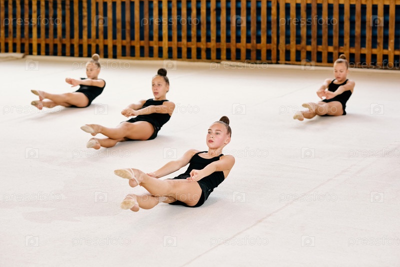 Группа девушек, практикующих ритмическую гимнастику на коврике