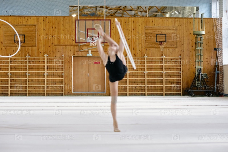 Девушка-подросток выполняет рутинную ритмическую гимнастику в помещении