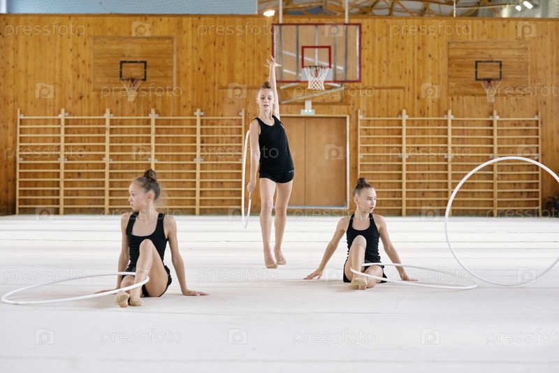 Три девочки-подростки практикуют ритмическую гимнастику с крючками в помещении