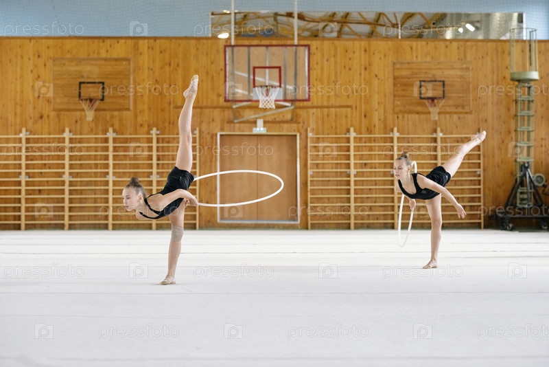 Девочки-подростки выполняют ритмическую гимнастику с помощью крючков