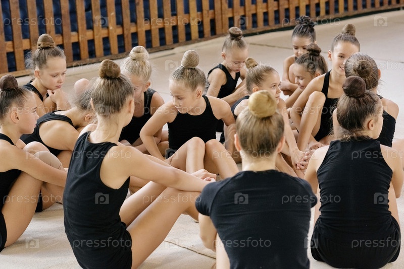 Группа девочек в возрасте до девятнадцати лет, сидящих вместе и готовящихся к гимнастической практике