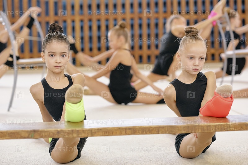 Две девочки, занимающиеся гимнастикой и упражнениями по растяжению в спортзале