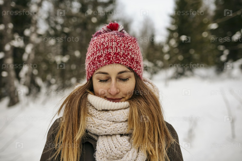 Мечтательная женщина в зимнем лесу Content