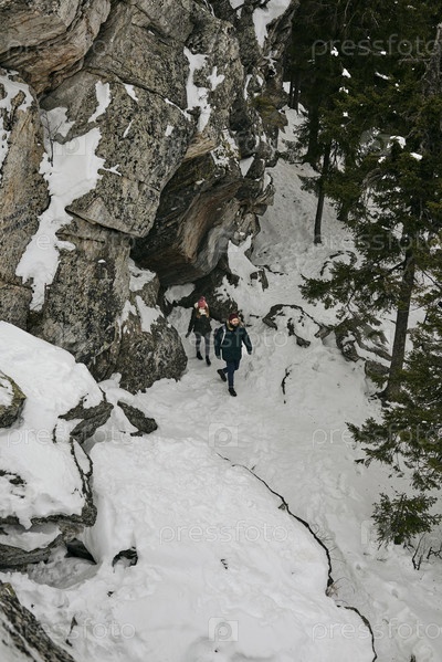 Пара ходит по зимнему лесу с камнями