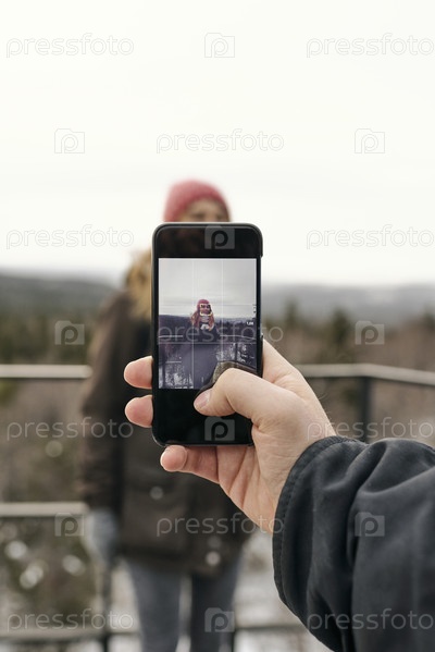 Человек с урожаем фотографирует женщину в природе