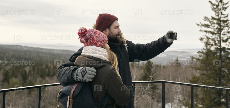 Романтическая пара делает селфи в зимней природе