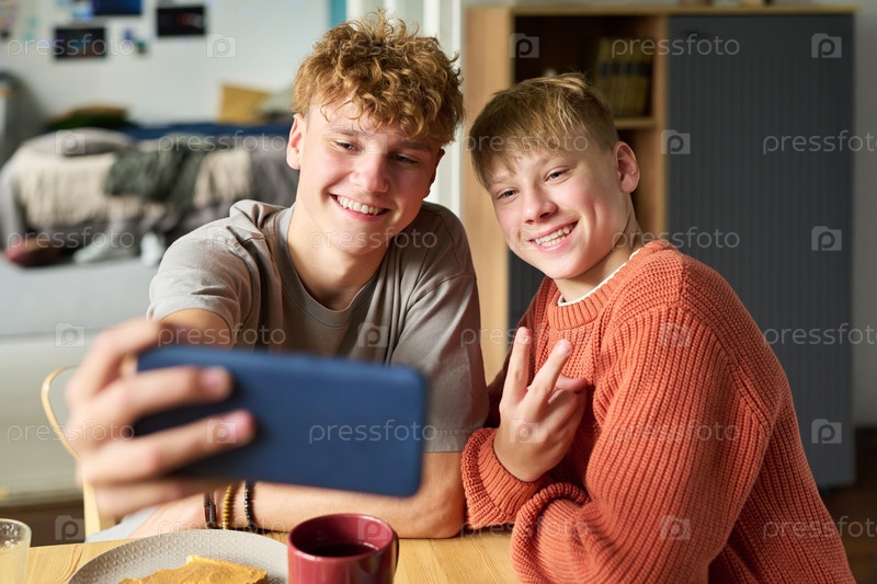 Братья-подростки улыбаются и делают селфи вместе в помещении