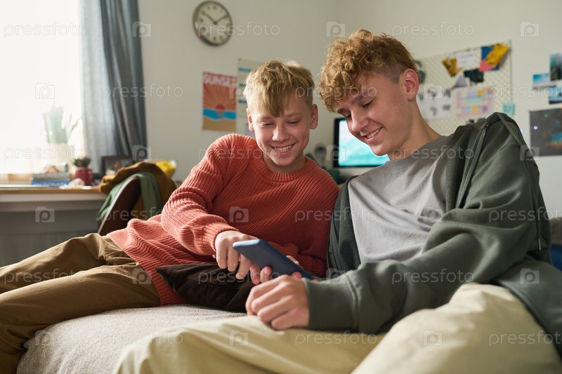 Подростковые братья сидят вместе и смеются, используя смартфоны в помещении
