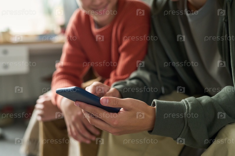 Братья-подростки сидят вместе, используя смартфоны и улыбаются в помещении