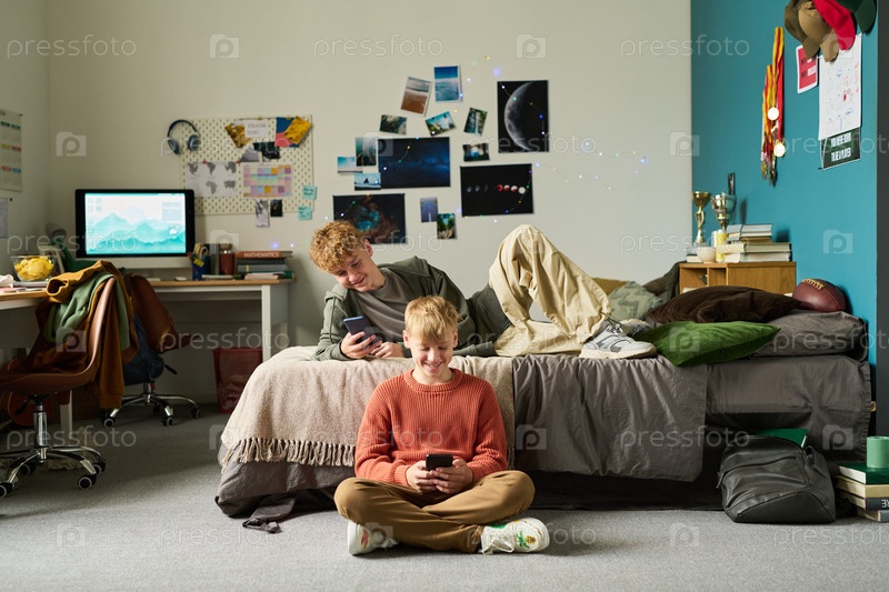 Подростковые братья используют цифровые планшеты, чтобы расслабиться в спальне