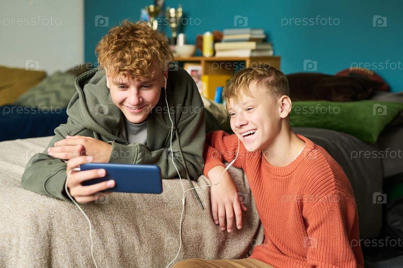Подростковые братья смотрят видео вместе на смартфоне и улыбаются