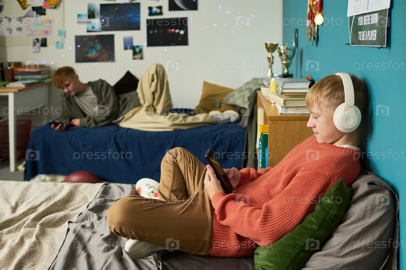 Подростковые братья отдыхают в спальне, используя смартфоны и наушники