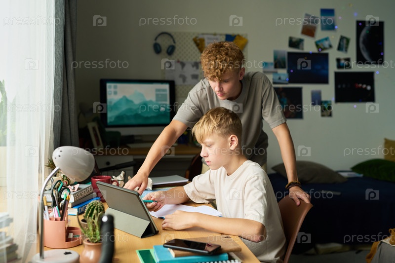 Подростковые братья работают вместе над домашним заданием с помощью цифрового планшета