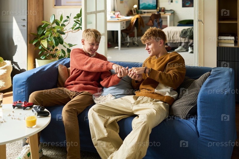 Подростковые братья соревнуются с игровыми контроллерами, сидя в помещении