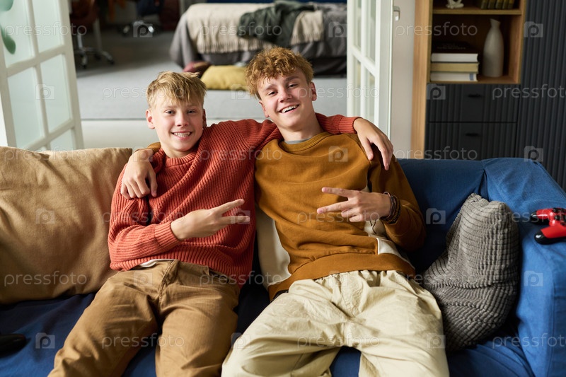 Братья-подростки сидят вместе на диване, улыбаются и жестикулируют мир