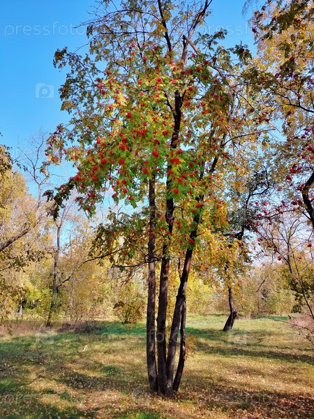 Дерево с букетами ягод на фоне осеннего парка