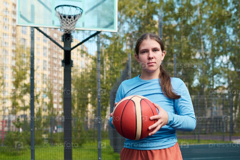 Портрет девочки-подростка, которая держит баскетбол и готовится к стритболу