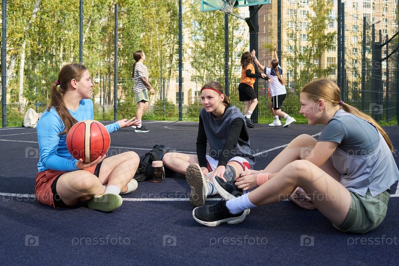 Группа девочек-подростков, отдыхающих после игры в стритбол на свежем воздухе