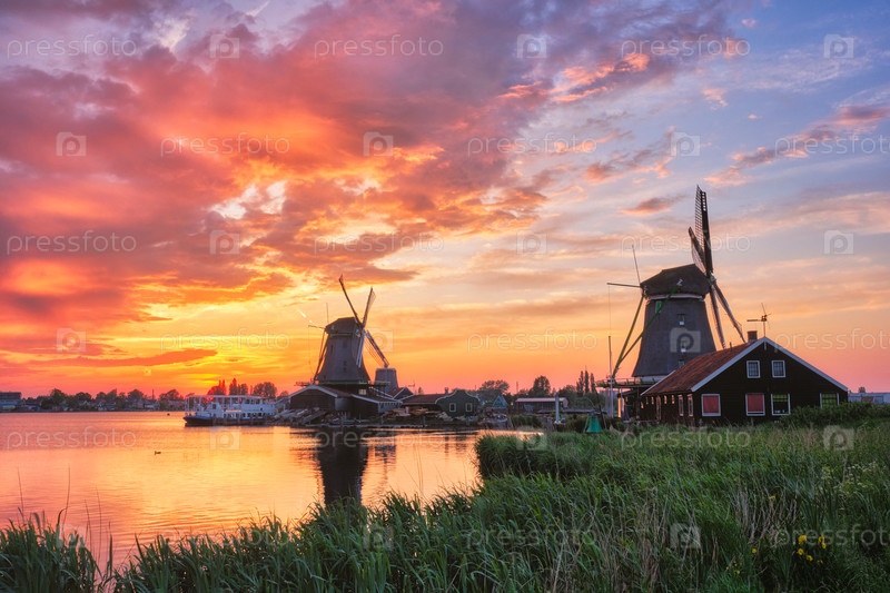 Ветряные мельницы в Заансе-Шанс в Голландии на закате