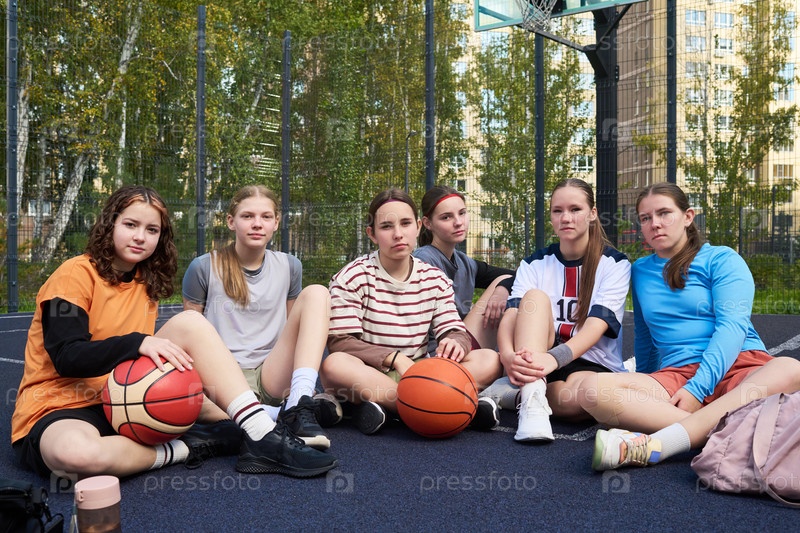 Группа девочек-подростков, сидящих отдыхая после игры в стритбол