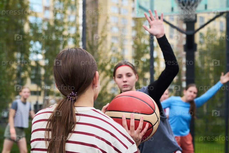 Подростки играют в уличный баскетбол на открытом городском корте